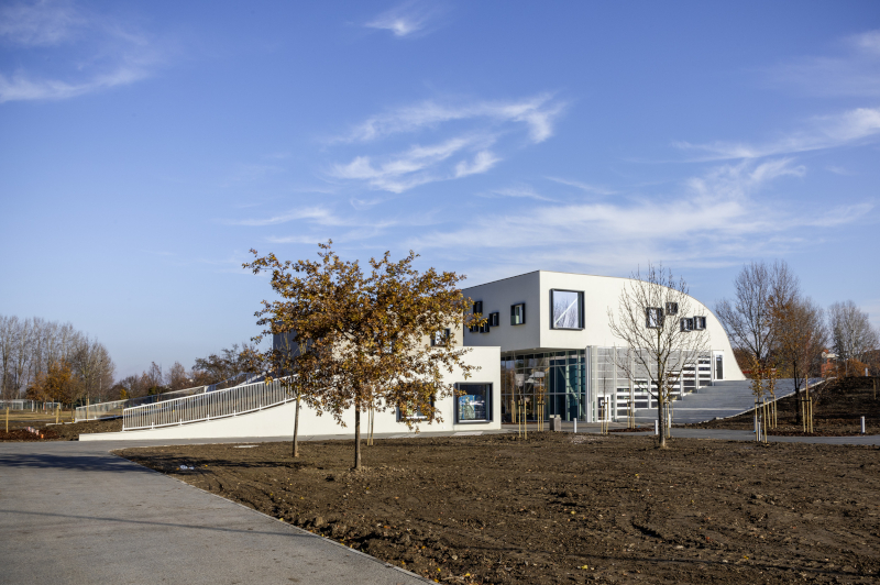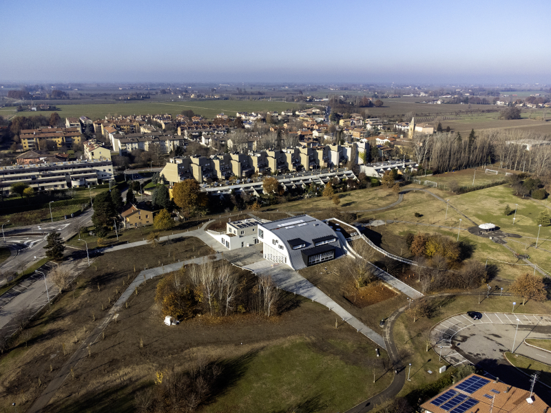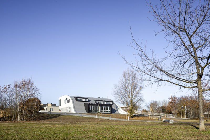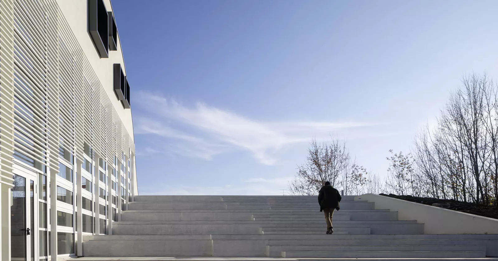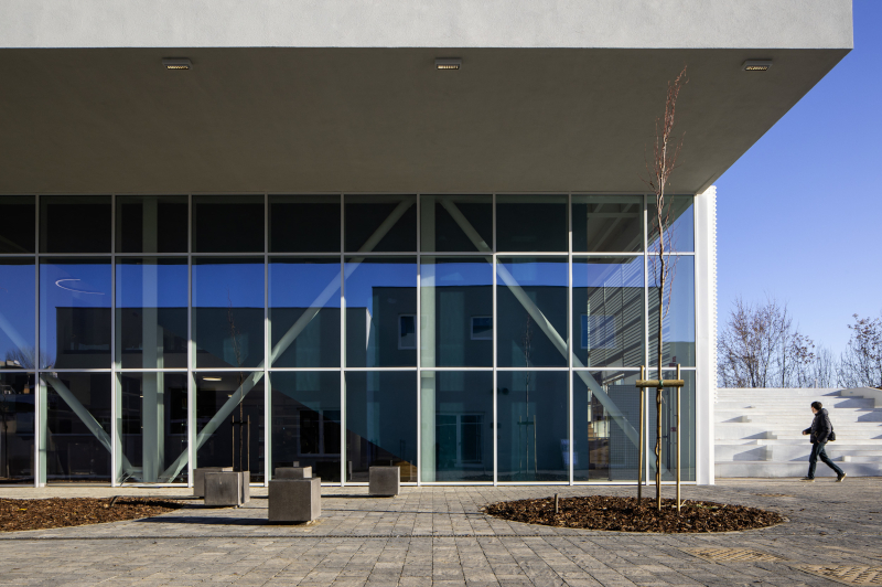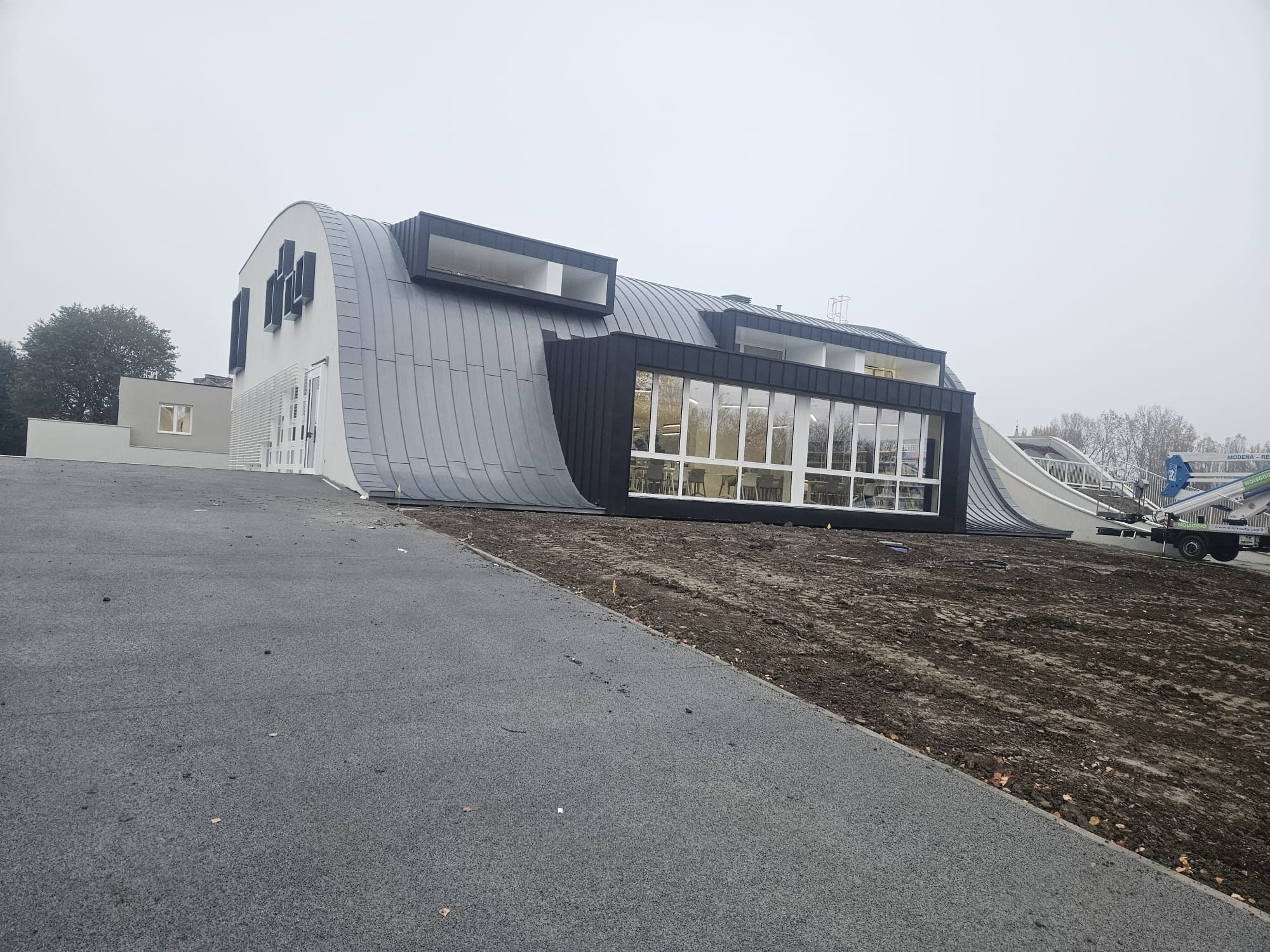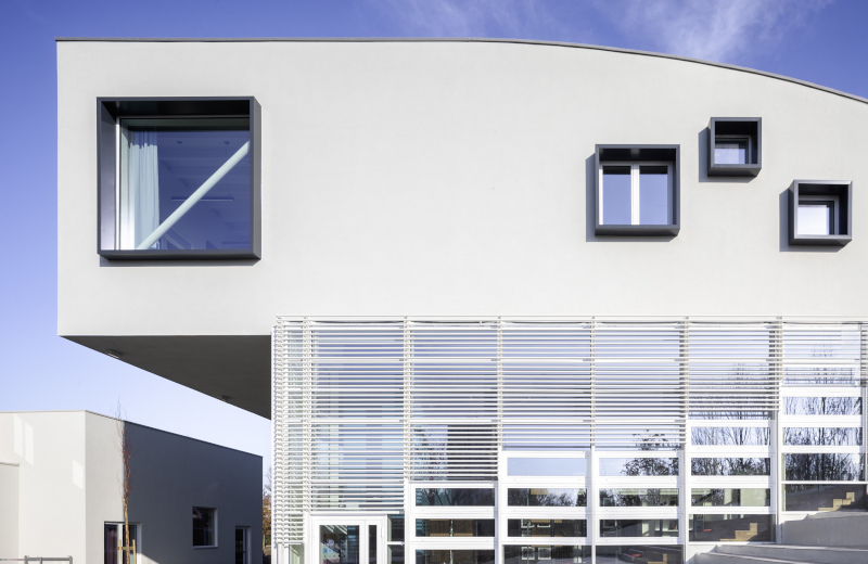 Copertura ventilata con finitura in lastre profilate di zinco al titanio Quartz Zinc e Anthra Zinc, posate mediante la tecnica dell’aggraffatura doppia; Brise soleil ad elementi tubolari orizzontali e struttura portante in profilati di alluminio estruso; Imbotti sporgenti costituiti da struttura portante in alluminio estruso e rivestimento in pannelli compositi in alluminio.