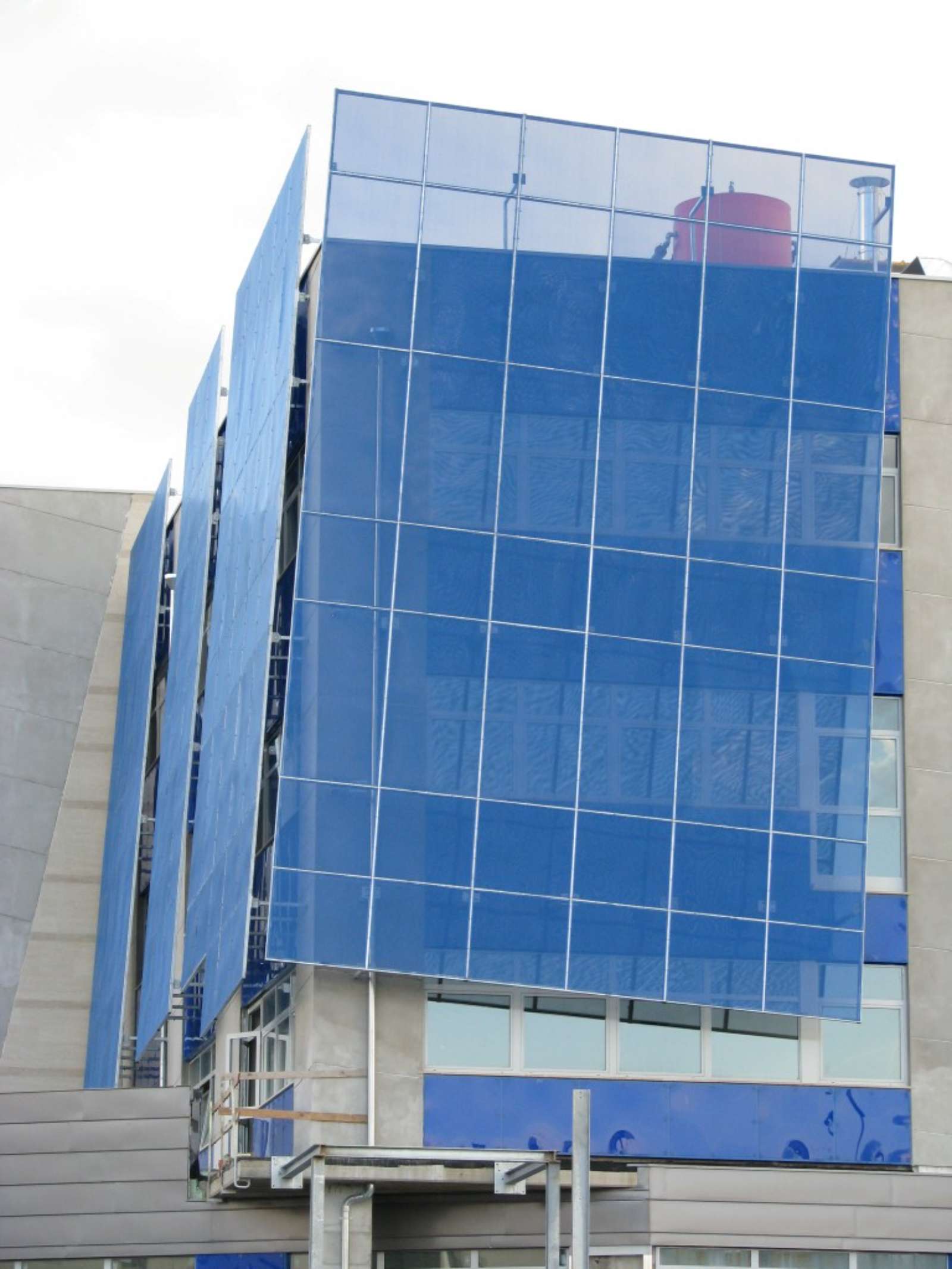 Le torri scala sono state rivestite, oltre che con la tecnica suddetta, con pannelli in alluminio di grandi dimensioni e spessore pari a 2 mm. Sono state infine realizzate le grandi schermature frangisole, in acciaio preverniciato microforato.