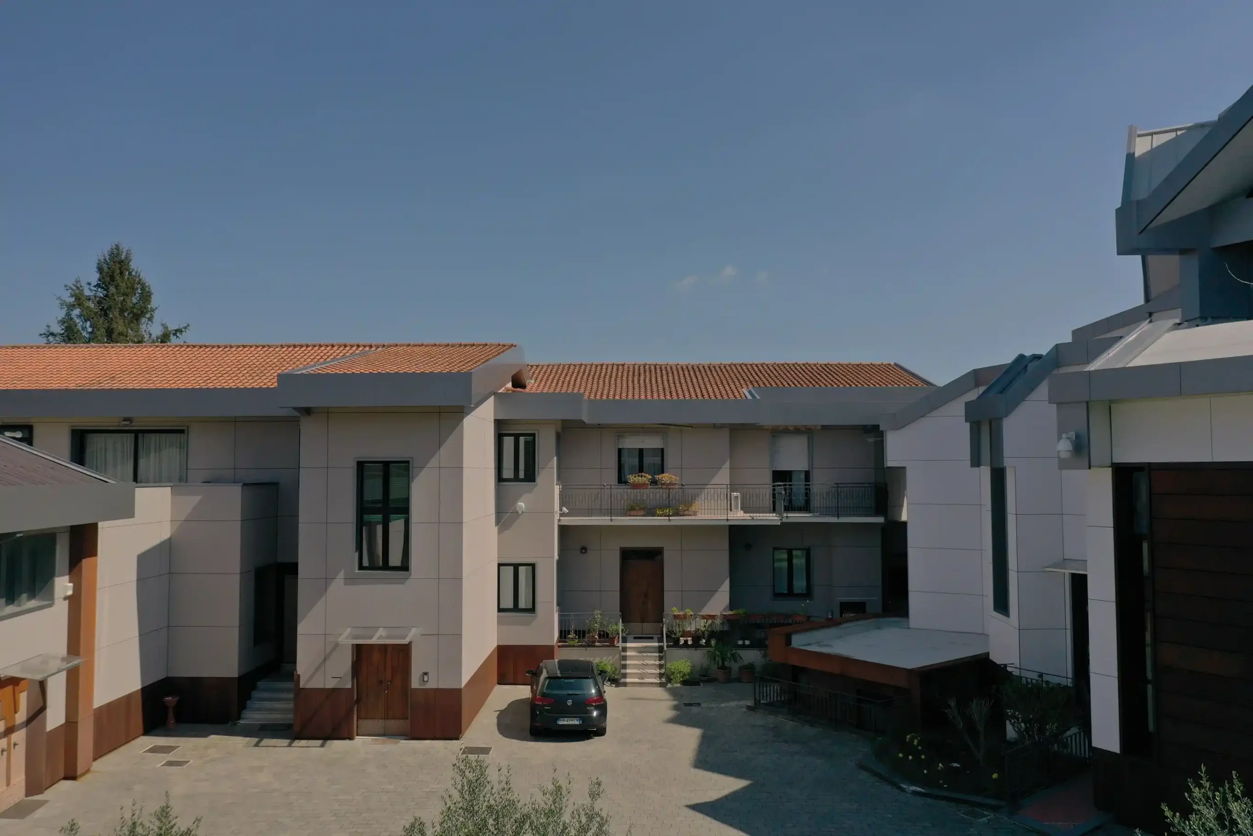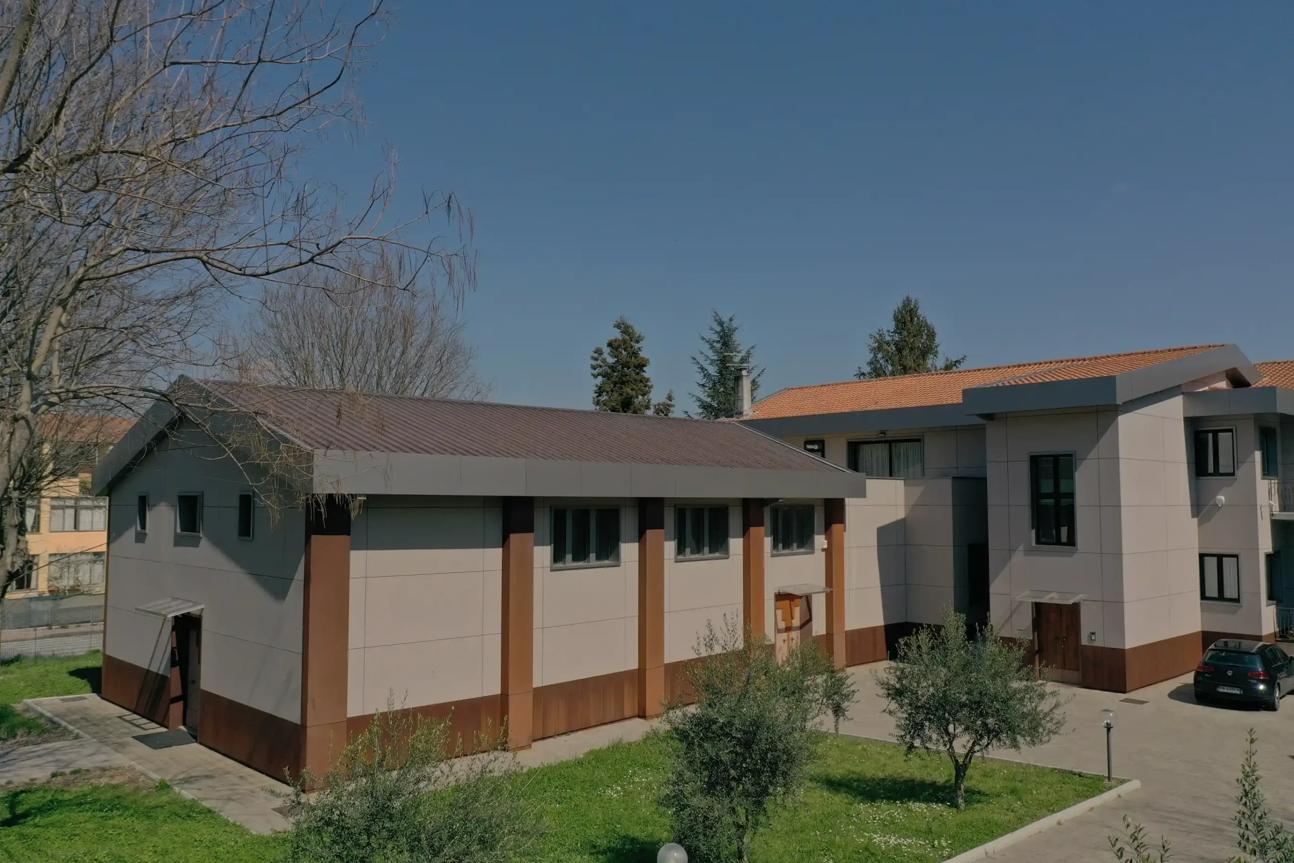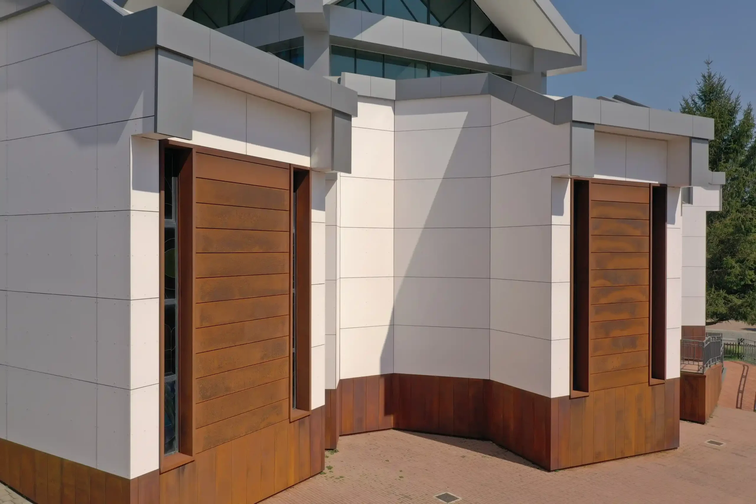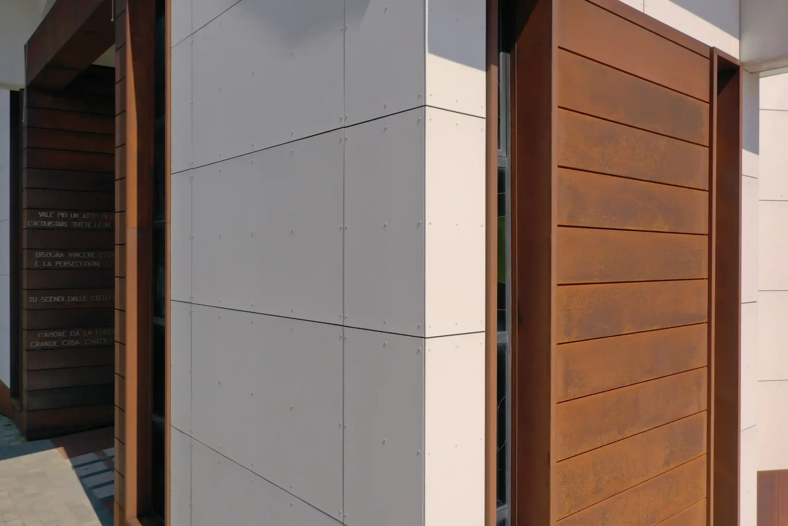 Facciata ventilata con finitura in pannelli di fibrocemento ecologico; Doghe in Acciaio Corten Ossidato; Carter in pannelli compositi in alluminio; Manto di copertura in lastre di alluminio profilate.