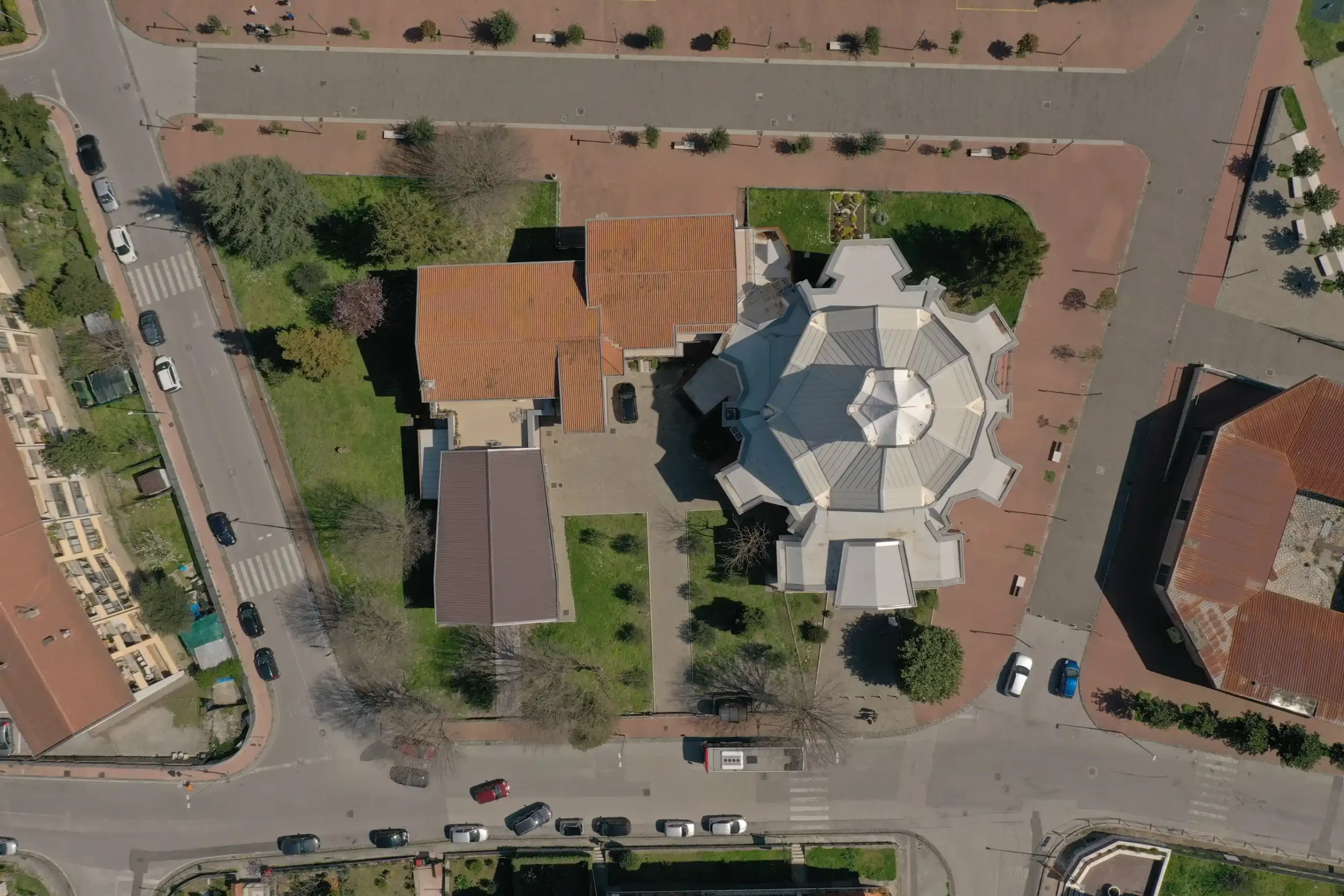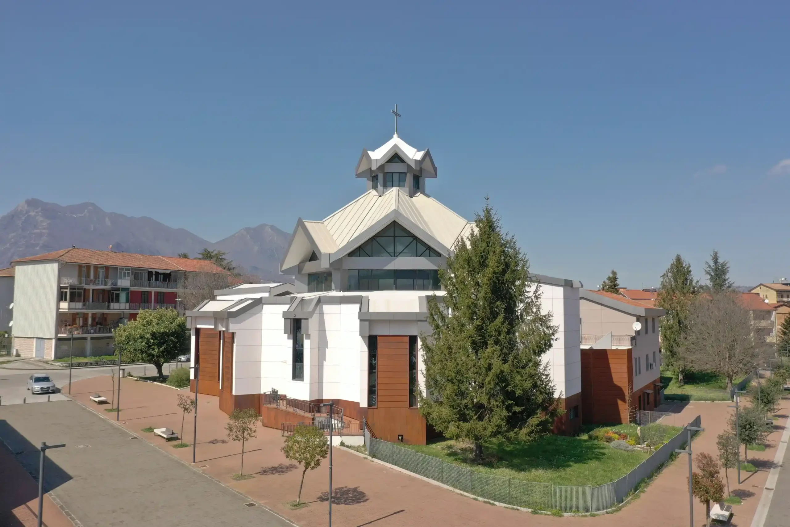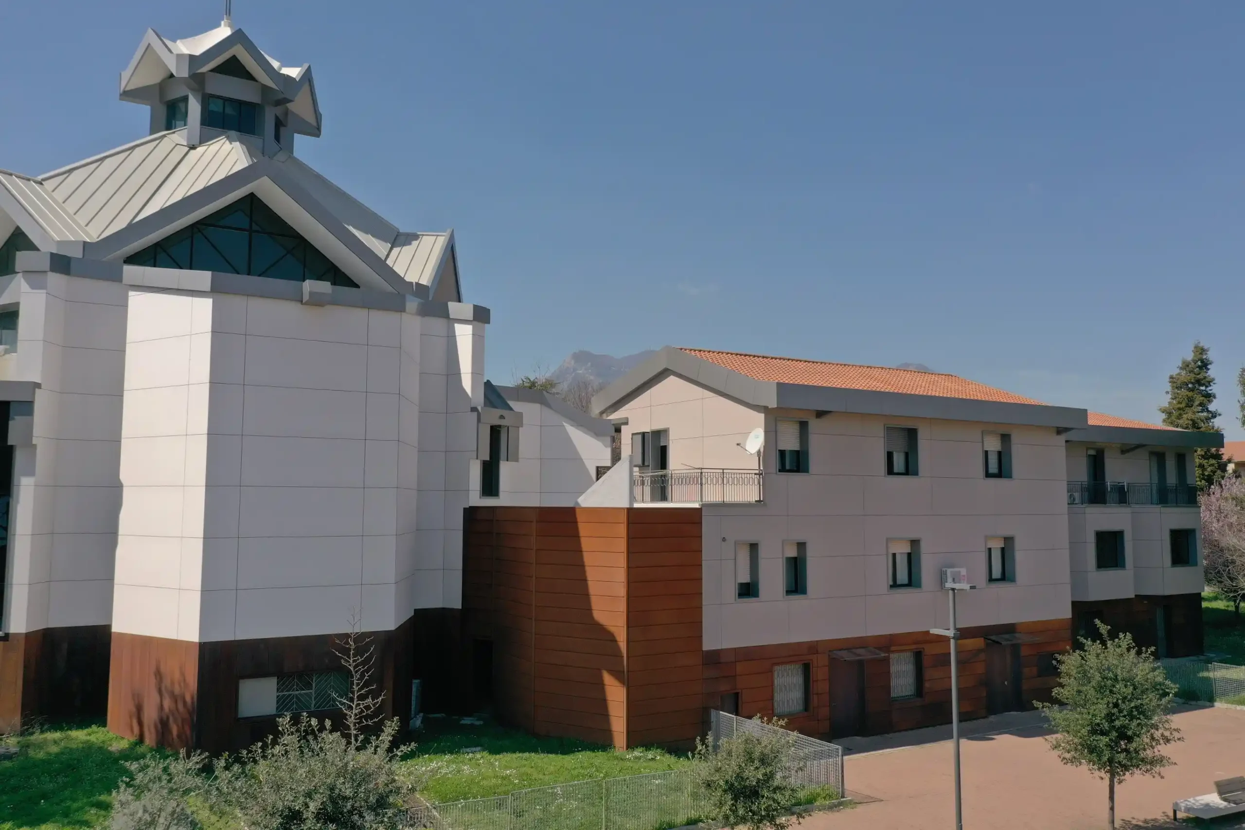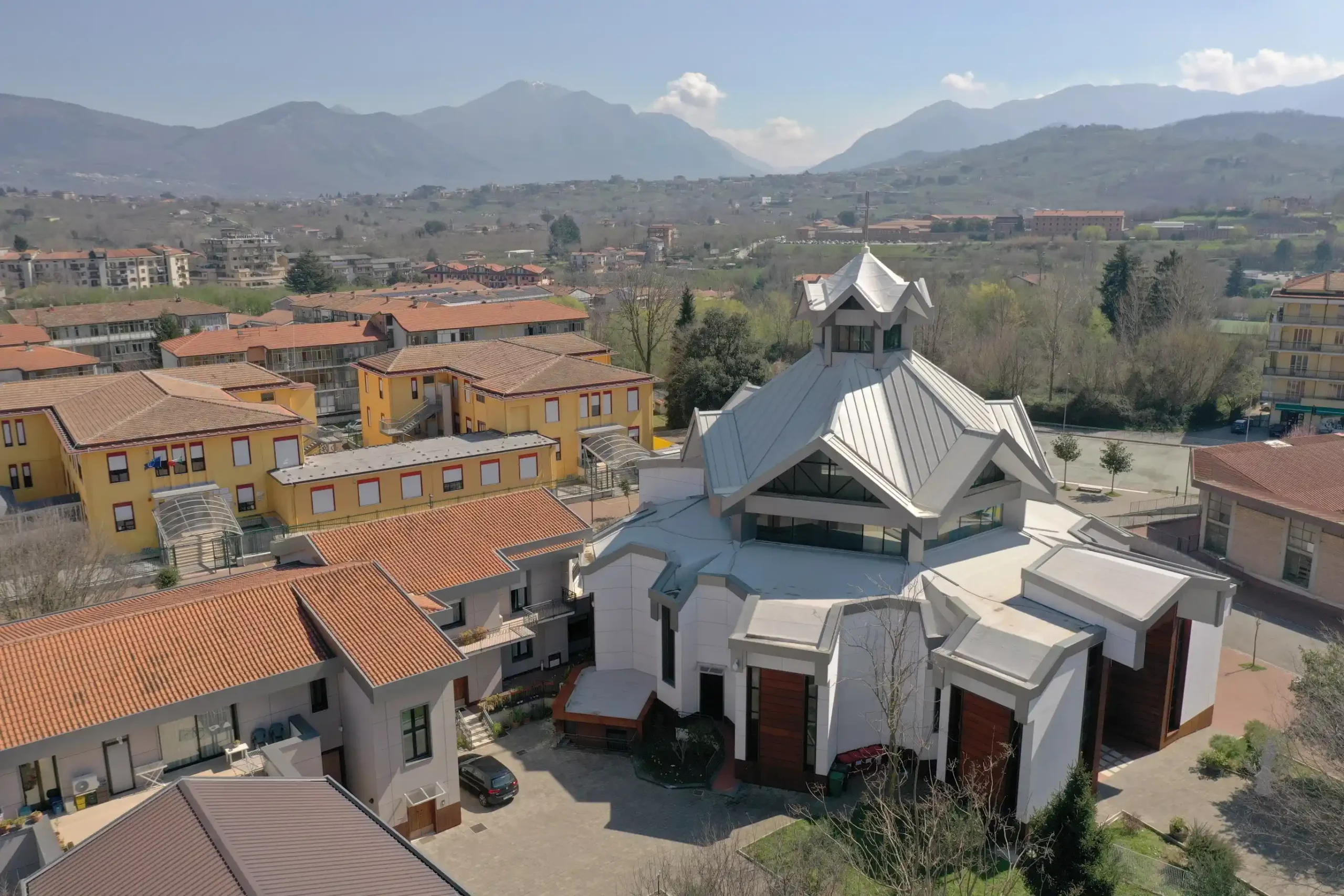 Facciata ventilata con finitura in pannelli di fibrocemento ecologico; Doghe in Acciaio Corten Ossidato; Carter in pannelli compositi in alluminio; Manto di copertura in lastre di alluminio profilate.
