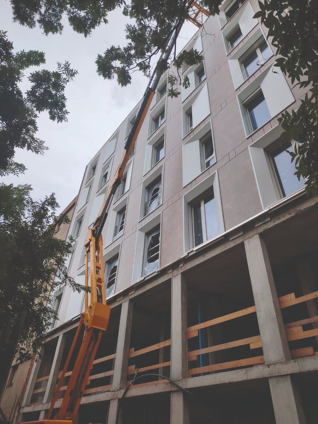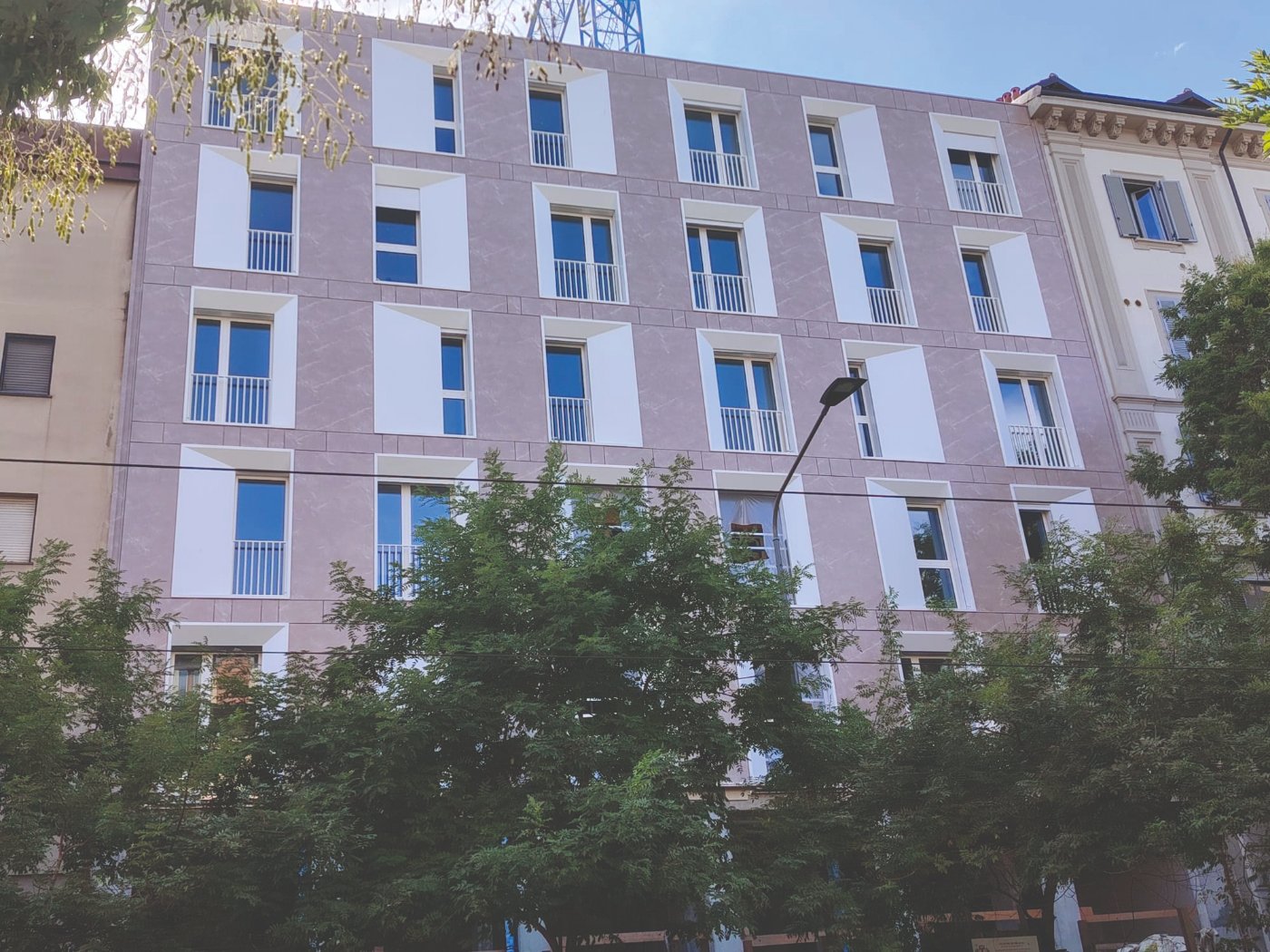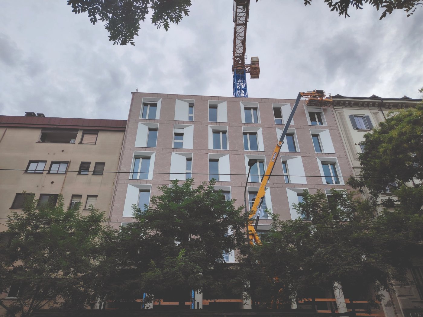 Facciata ventilata rivestita in pannelli compositi di alluminio, completa di sottostruttura metallica autoportante. Serramenti a teglio termico, in alluminio. Serramenti a taglio termico, in acciaio verniciato. Parapetti in profilati di alluminio – Fioriere balaustra.