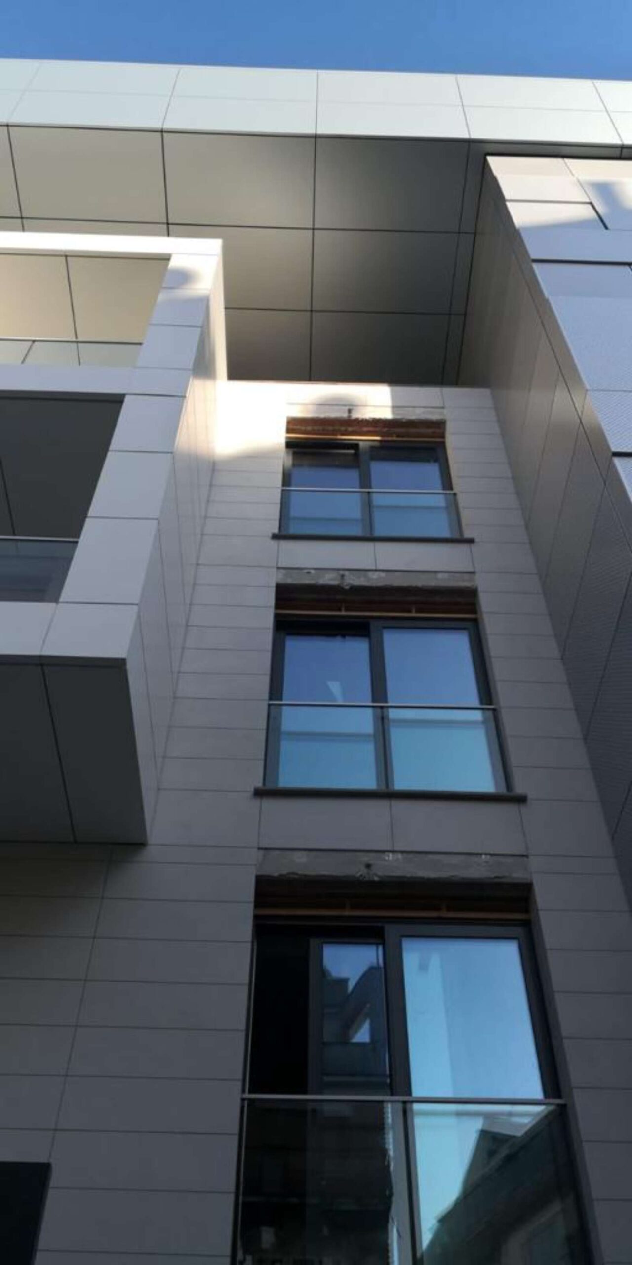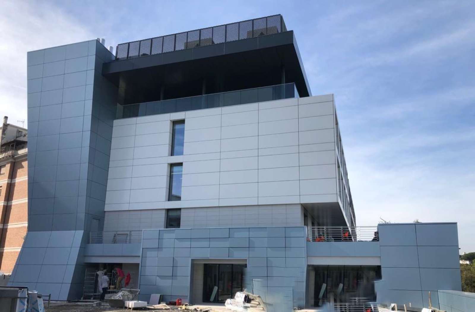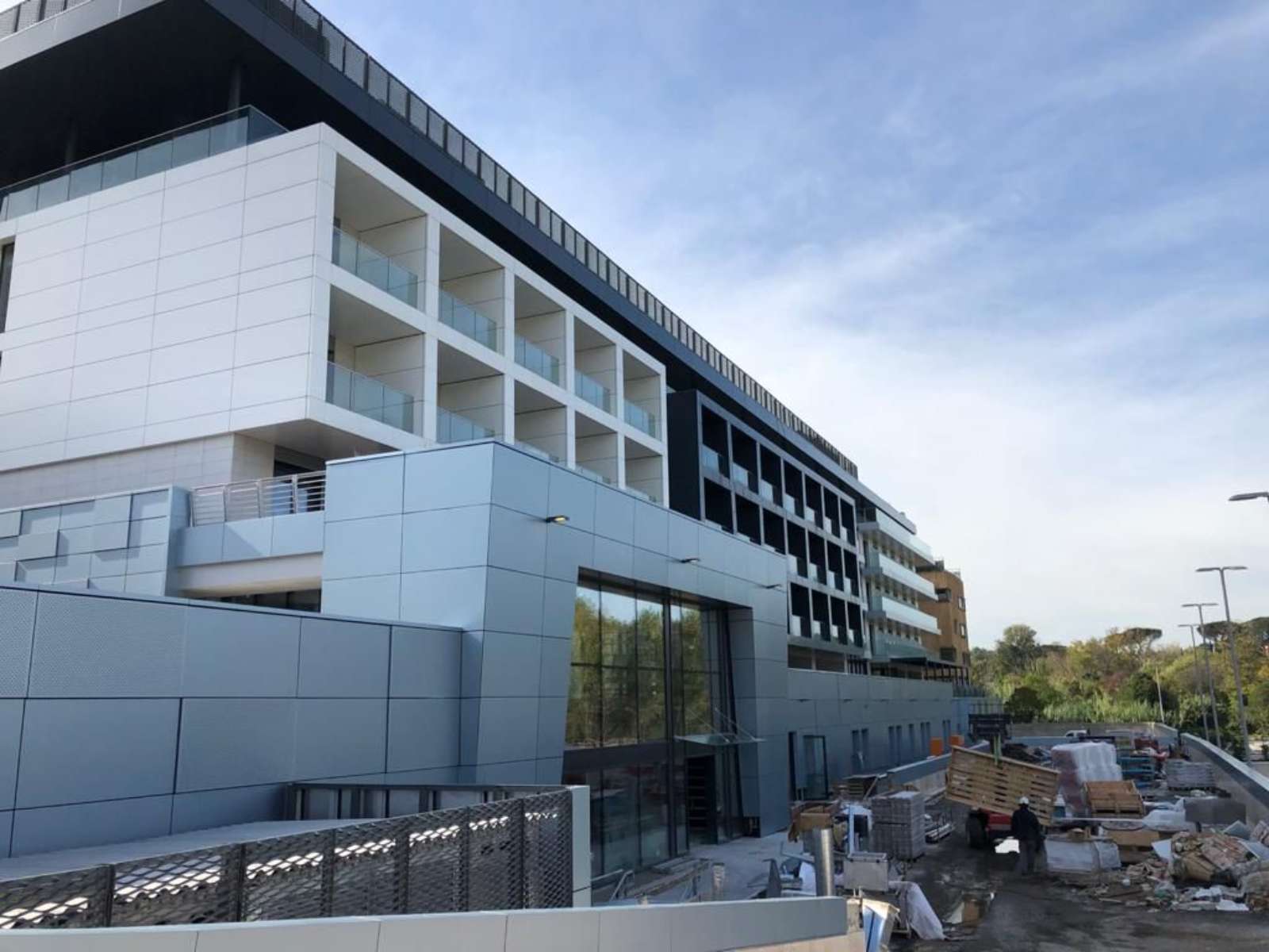 Sotto struttura in alluminio con realizzazione di tralicci realizzati con tubolari 50×50 con profili a ” T ” più staffe di appensione alluminio, con rivestimento di doghe in ALUCOBOND con fissaggio a scomparsa.