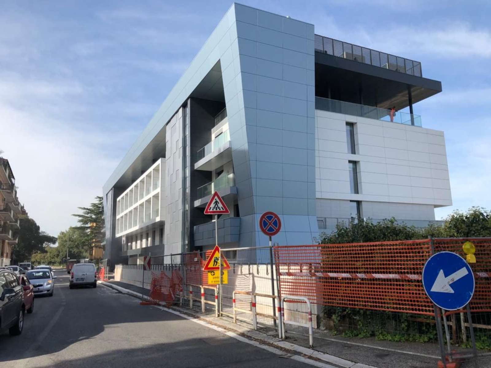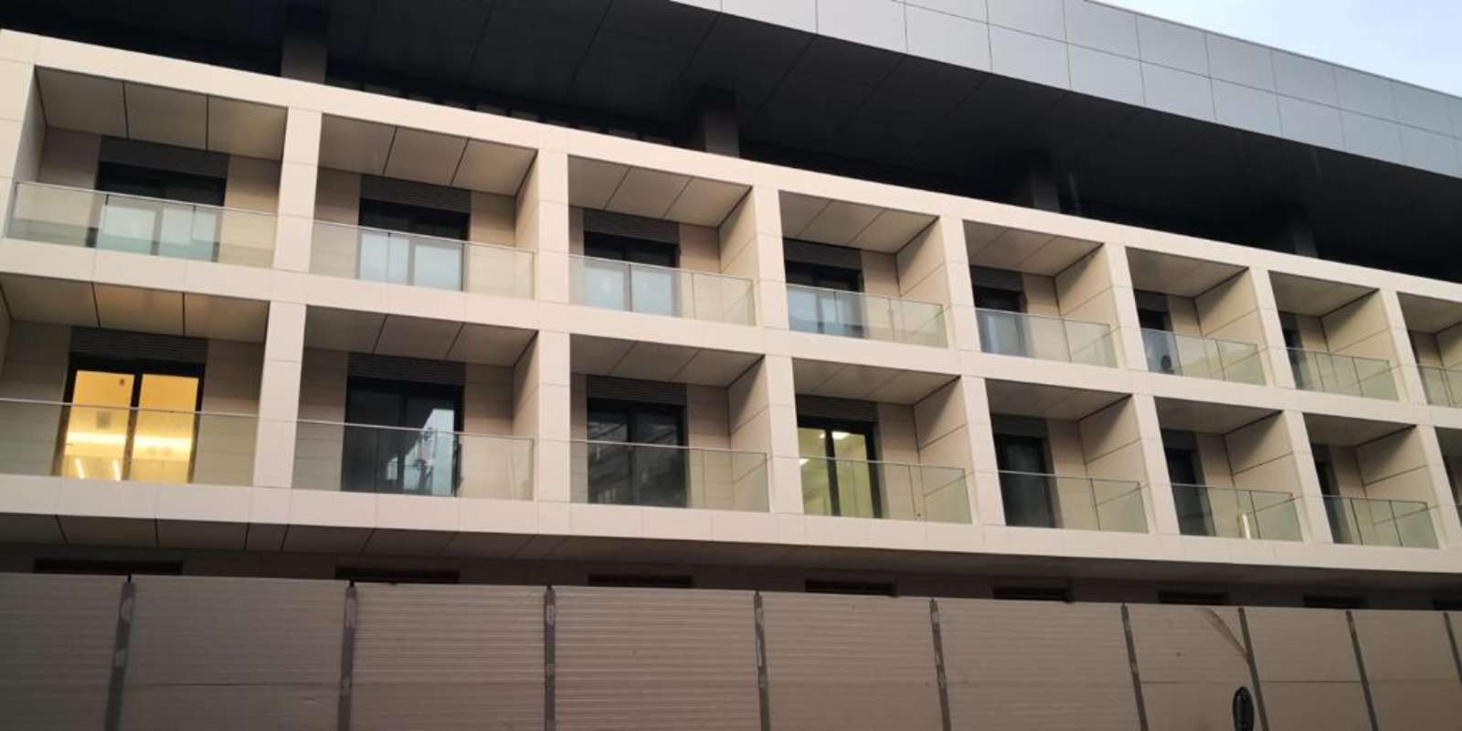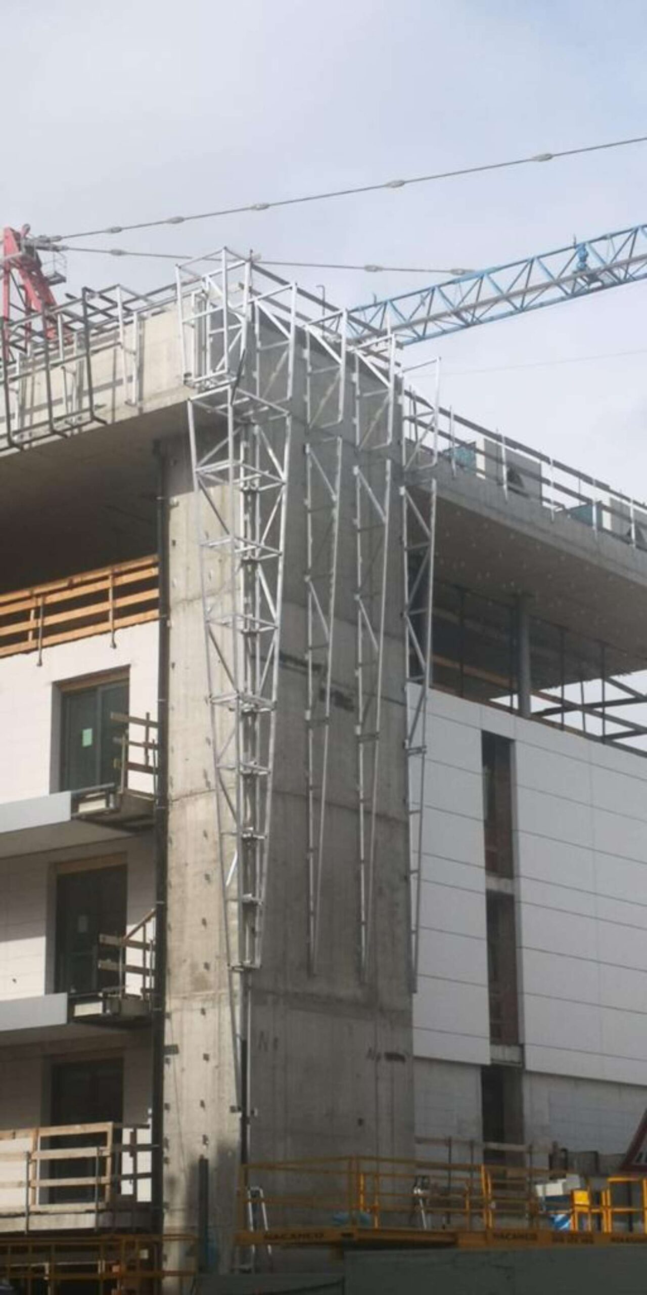 Sotto struttura in alluminio con realizzazione di tralicci realizzati con tubolari 50×50 con profili a ” T ” più staffe di appensione alluminio, con rivestimento di doghe in ALUCOBOND con fissaggio a scomparsa.