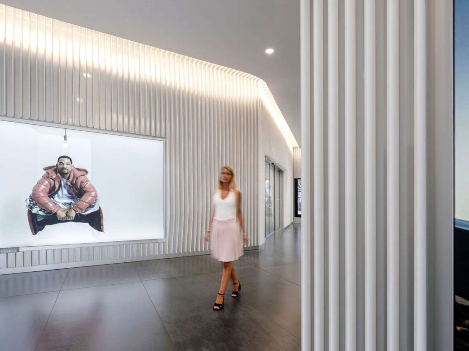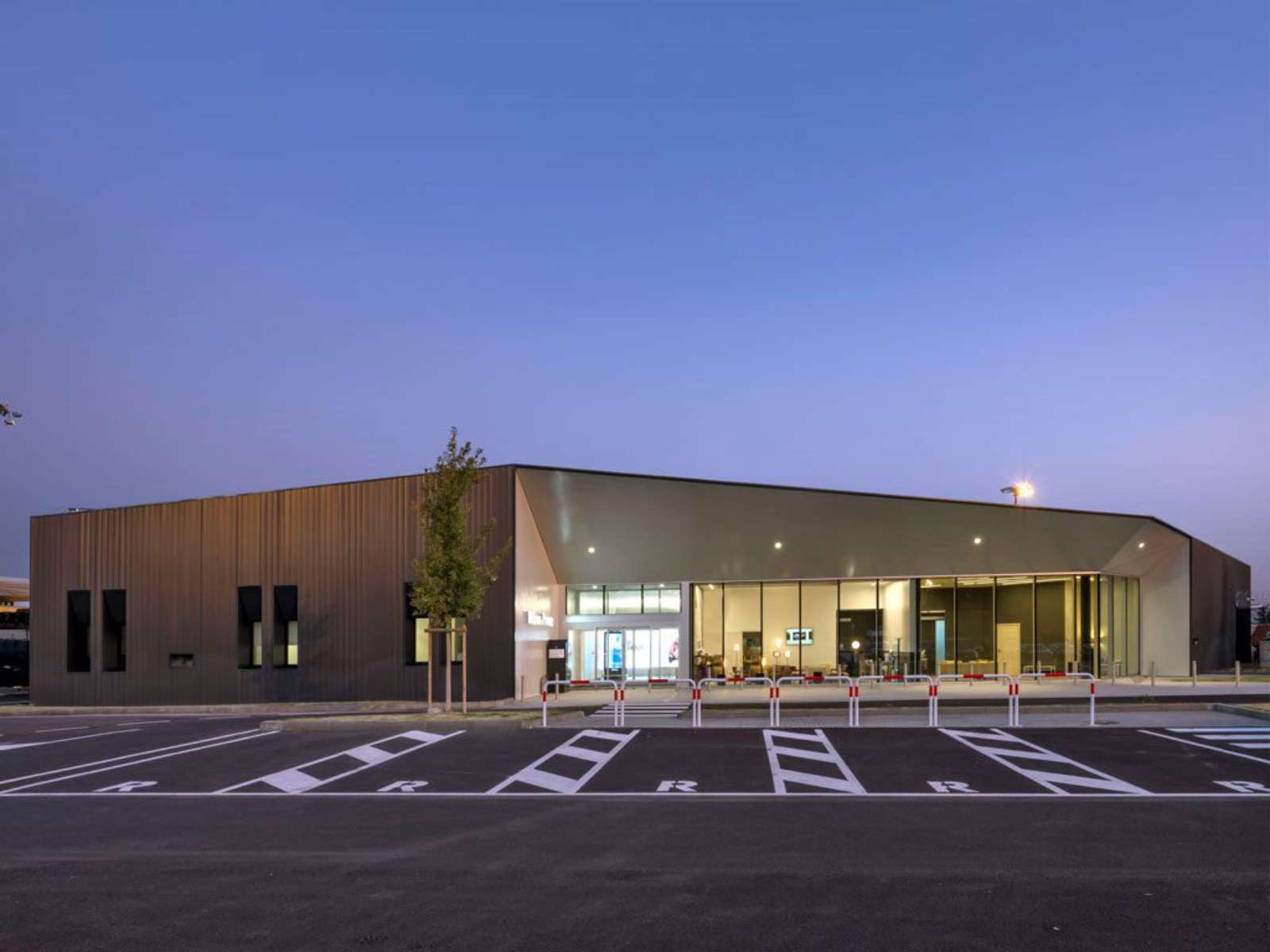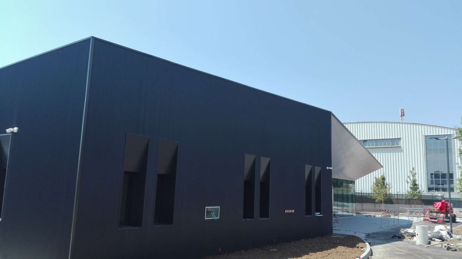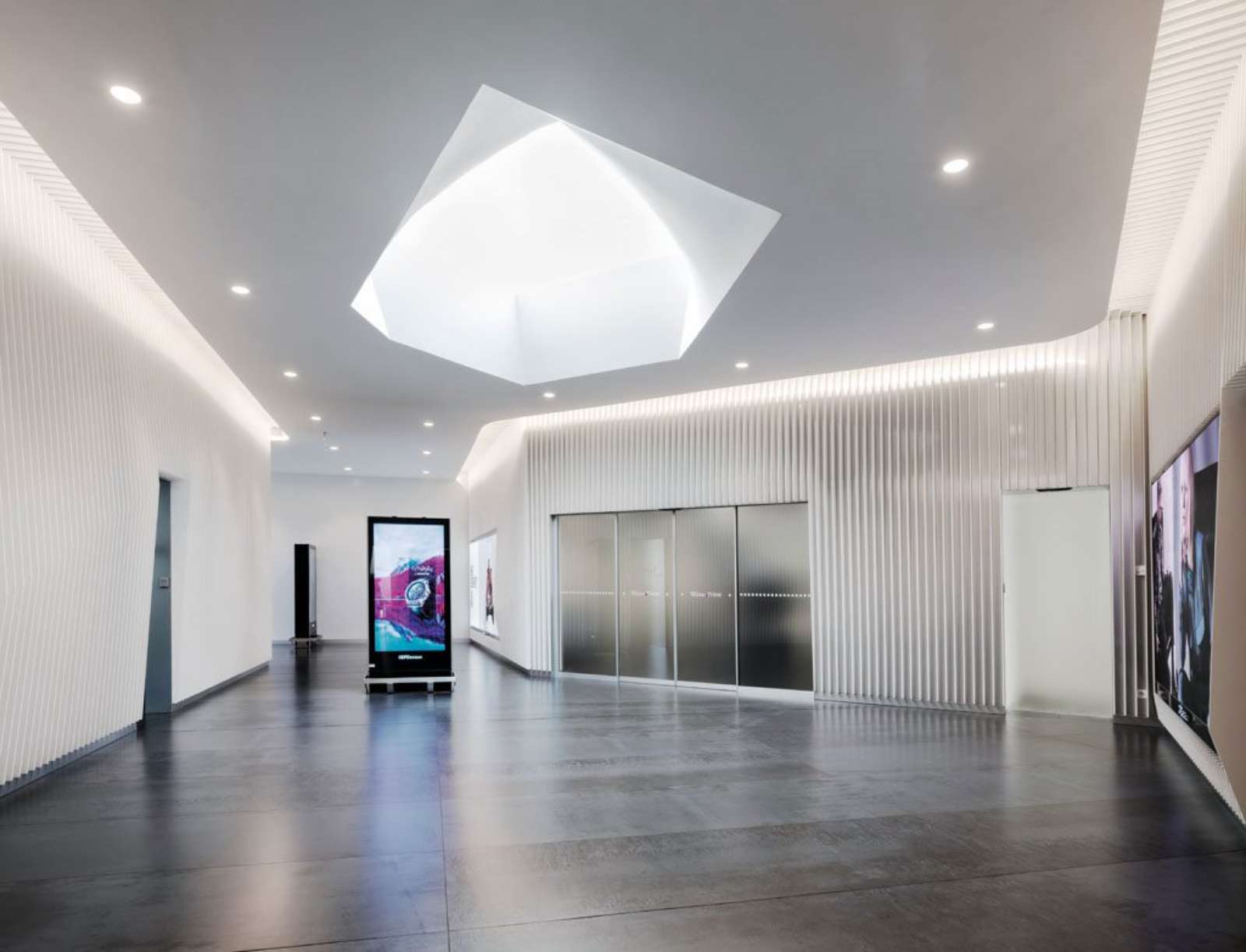 Il progetto è stato firmato dallo studio internazionale di architettura OneWorks. I lavori affidati alla ns. azienda hanno riguardato i rivestimenti dell’intero involucro edilizio. La copertura, oltre all’isolamento ed alla impermeabilizzazione, ha visto l’esecuzione di un manto a finitura in lastre in alluminio, posate mediante la tecnica dell’aggraffatura doppia. La facciata è caratterizzata da un rivestimento in profili estrusi di alluminio, opportunamente verniciati, dalla matrice a Z; il soffitto in zona ingresso è stato eseguito con sistema di rivestimento STO, in pannelli di granulato di vetro e finitura ad intonaco Stolit K, caratterizzato dall’assenza di giunti. Non meno apprezzabili i rivestimenti delle pareti interne, eseguiti con un sistema di “lame” verticali in DuPont Corian ®, dal pregevole effetto architettonico.