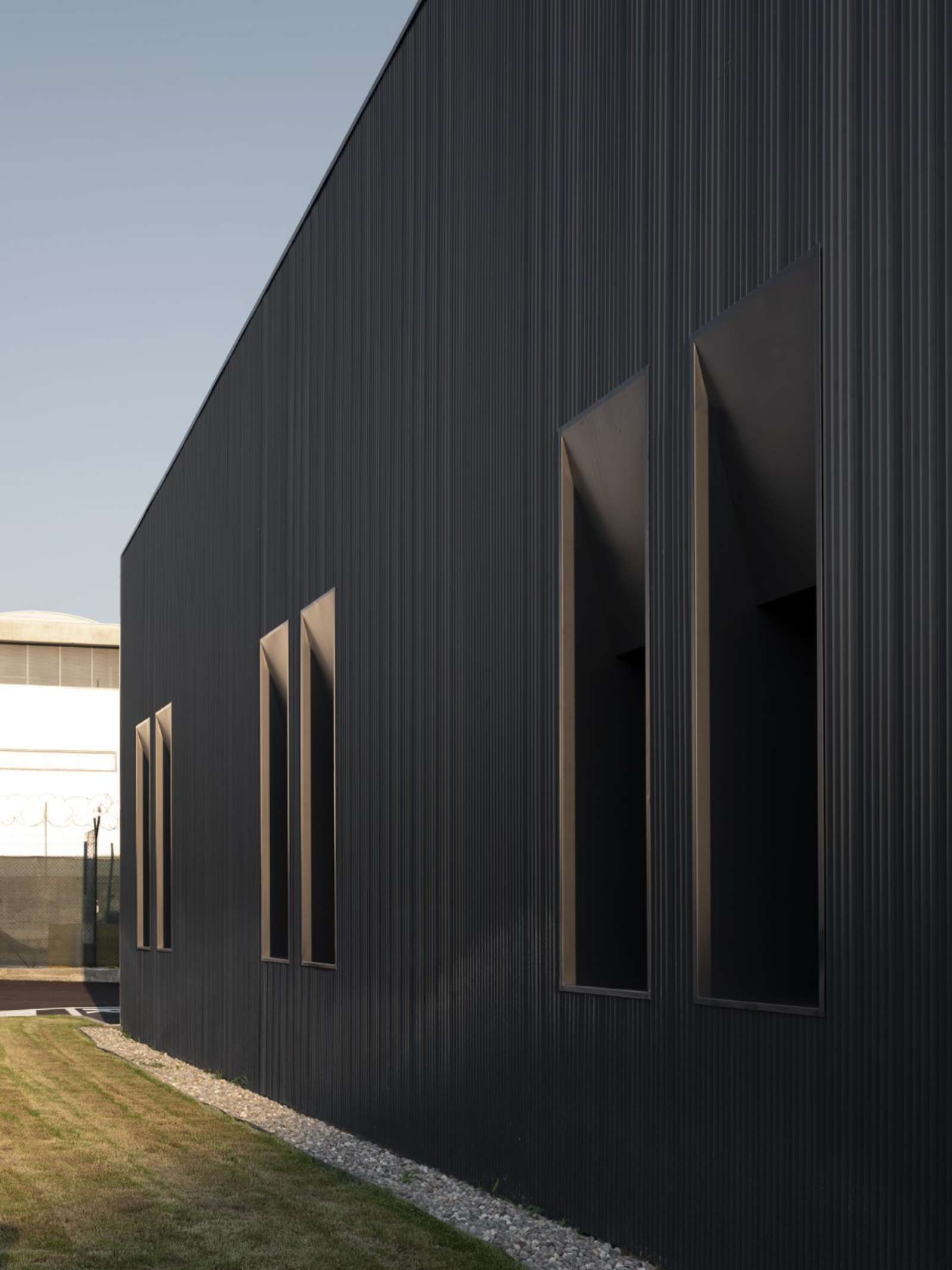 L’edificio pentagonale è rivestito con pannelli d’alluminio prodotti da Prefa (superficie nera) e Sto (imbotti color madreperla).