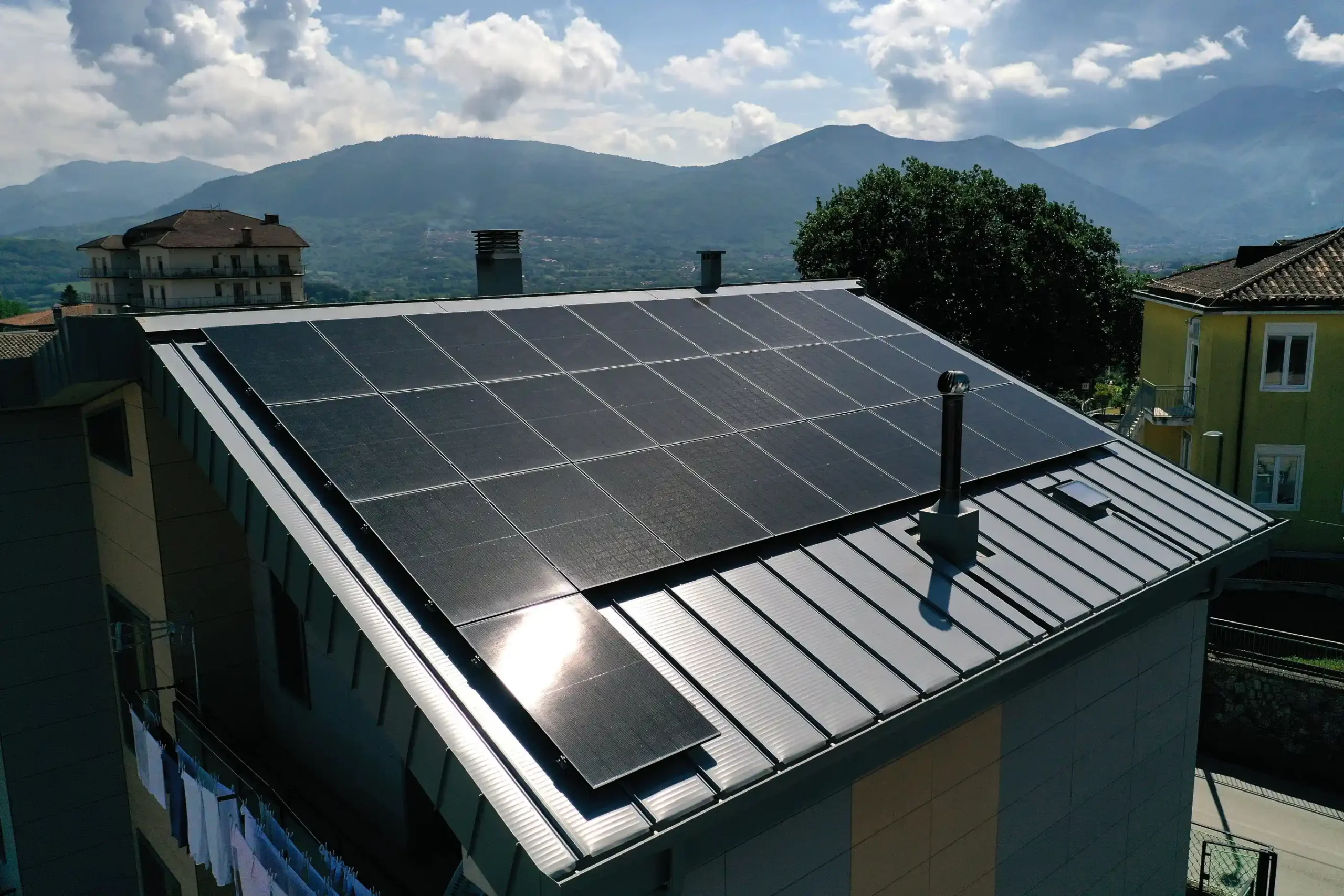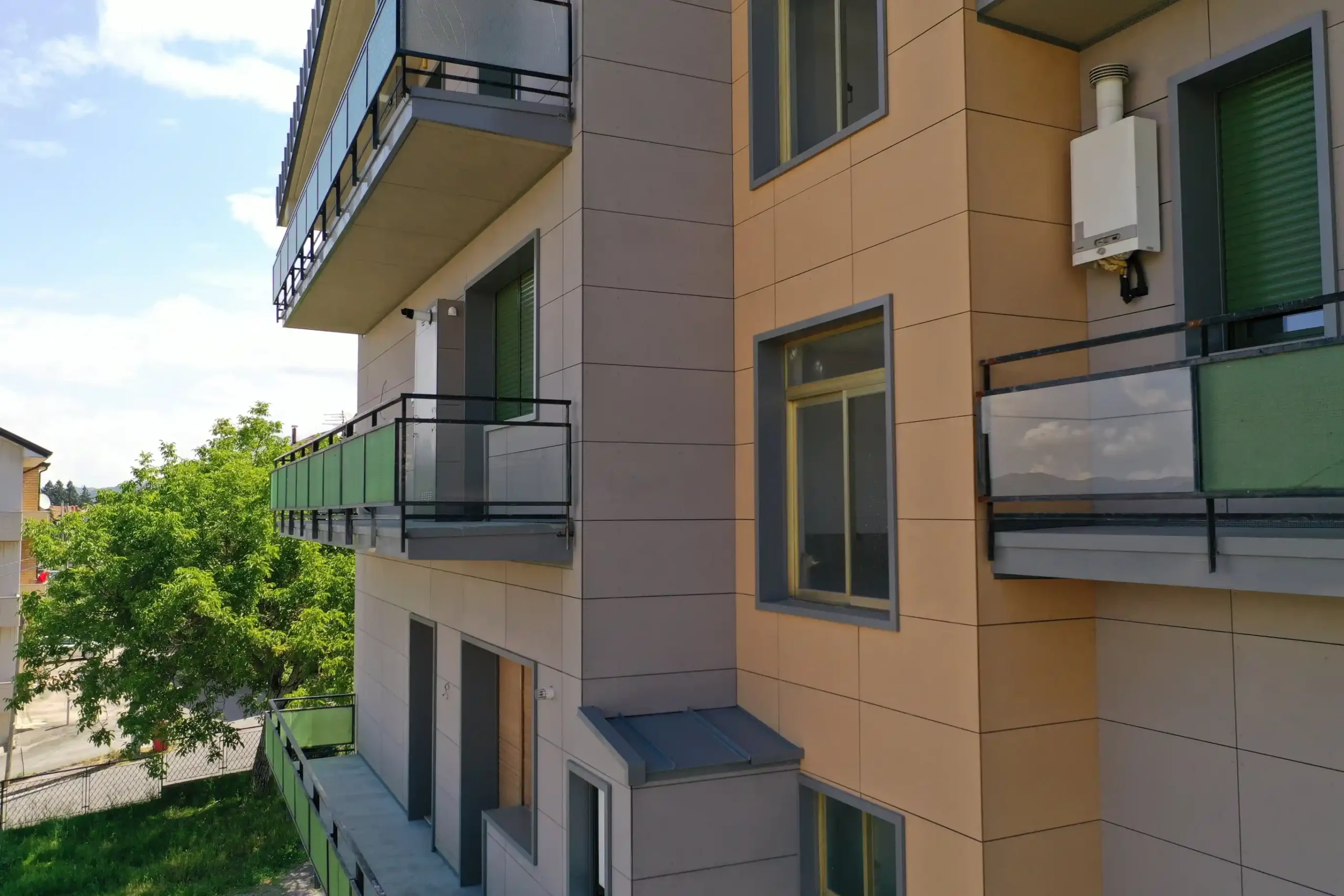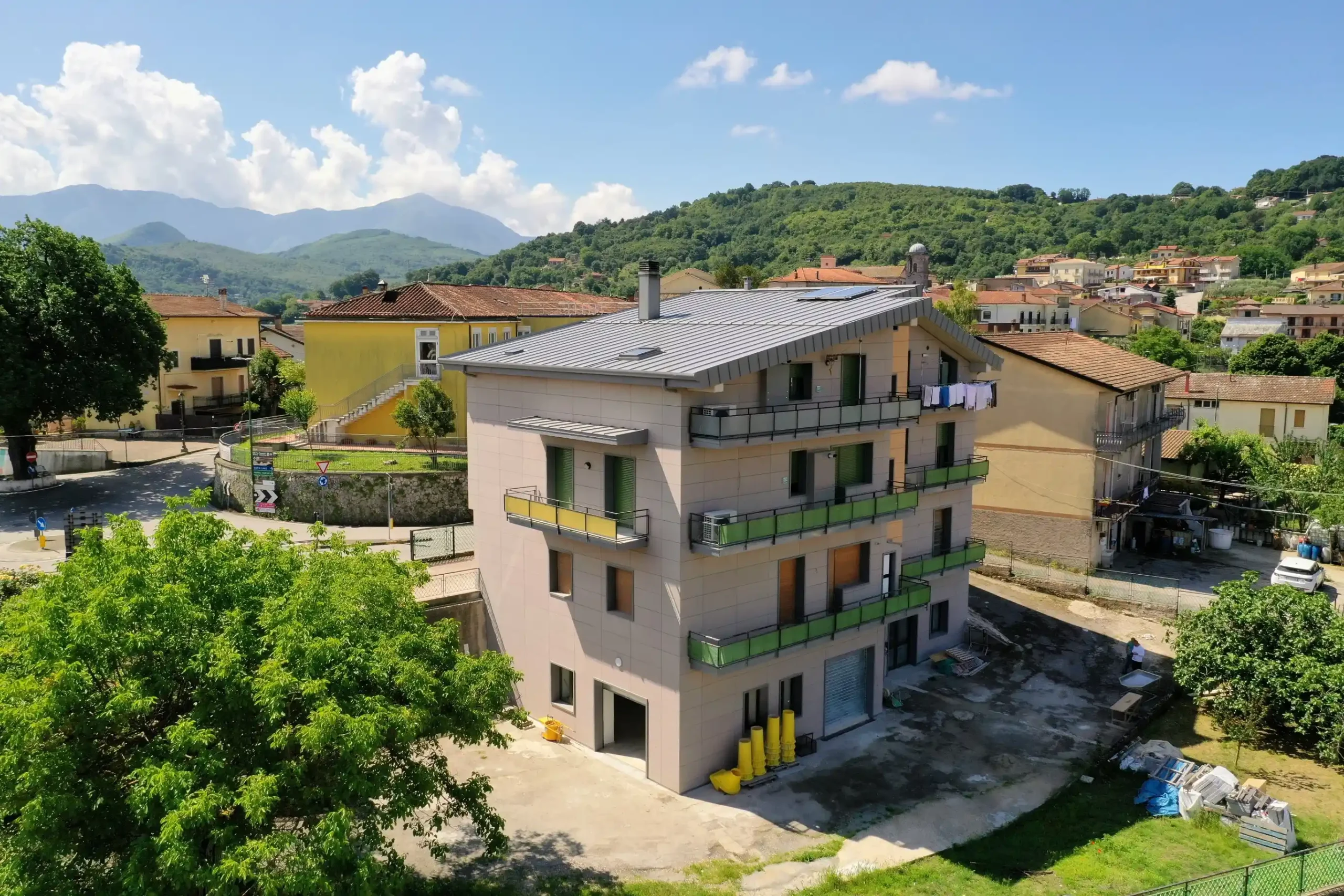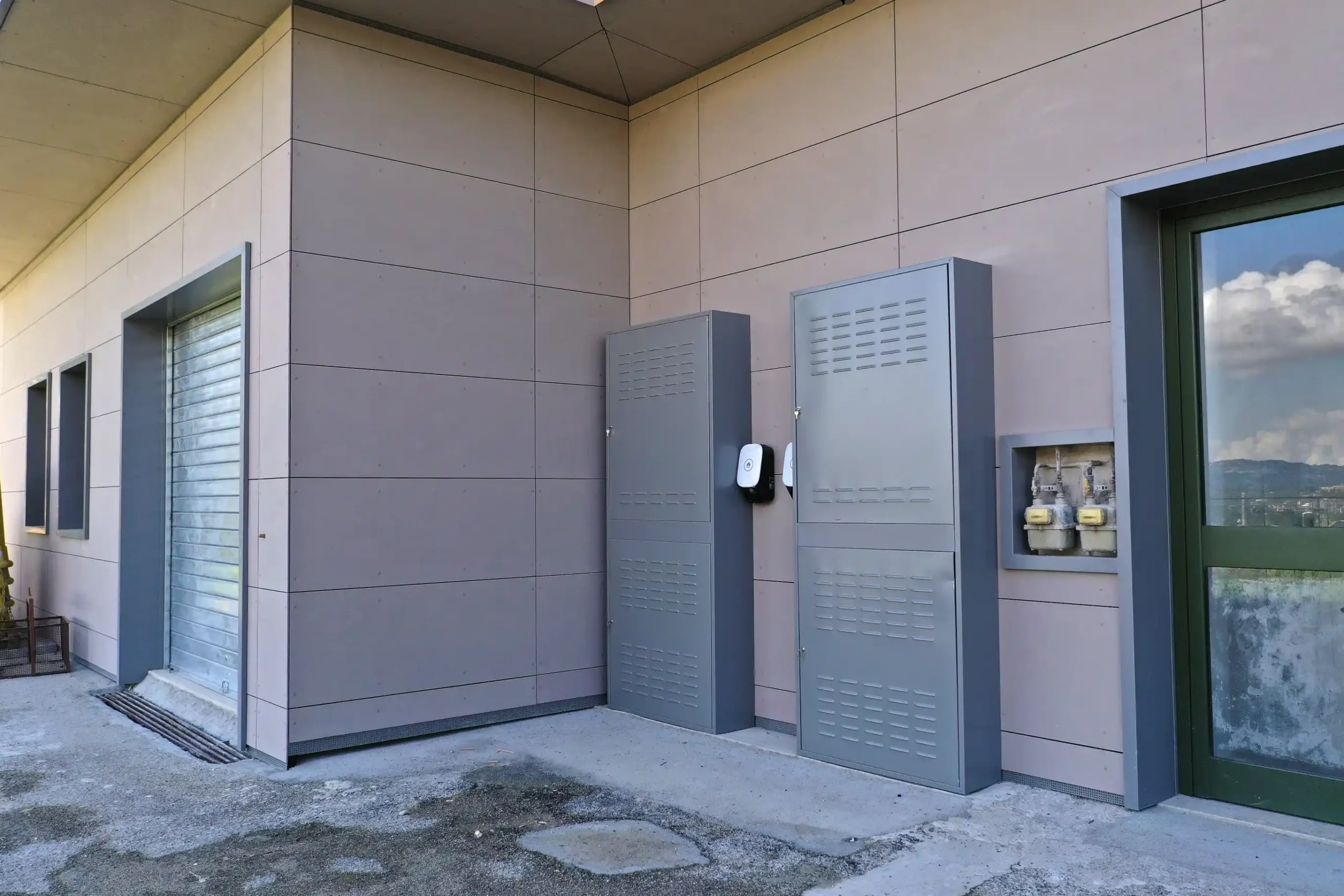 Copertura ventilata con finitura in lastre di alluminio profilate; Facciata ventilata con finitura in pannelli di fibrocemento ecologico; Serramenti a taglio termico di alluminio.
