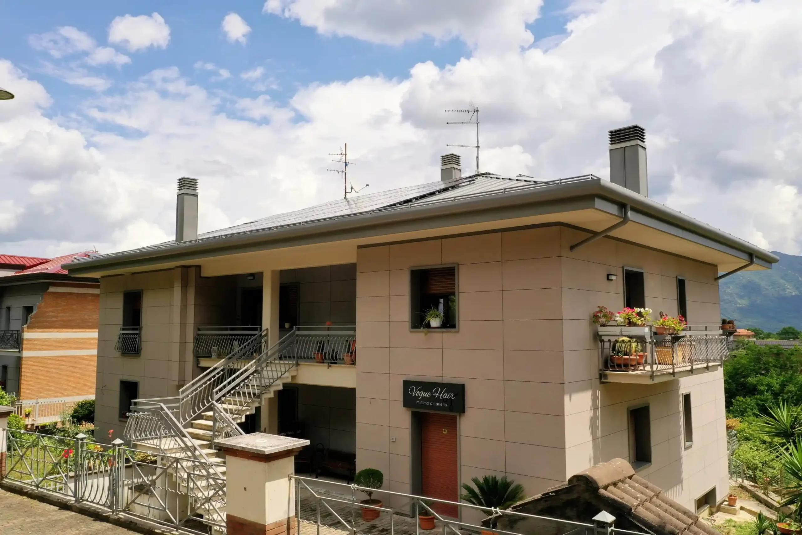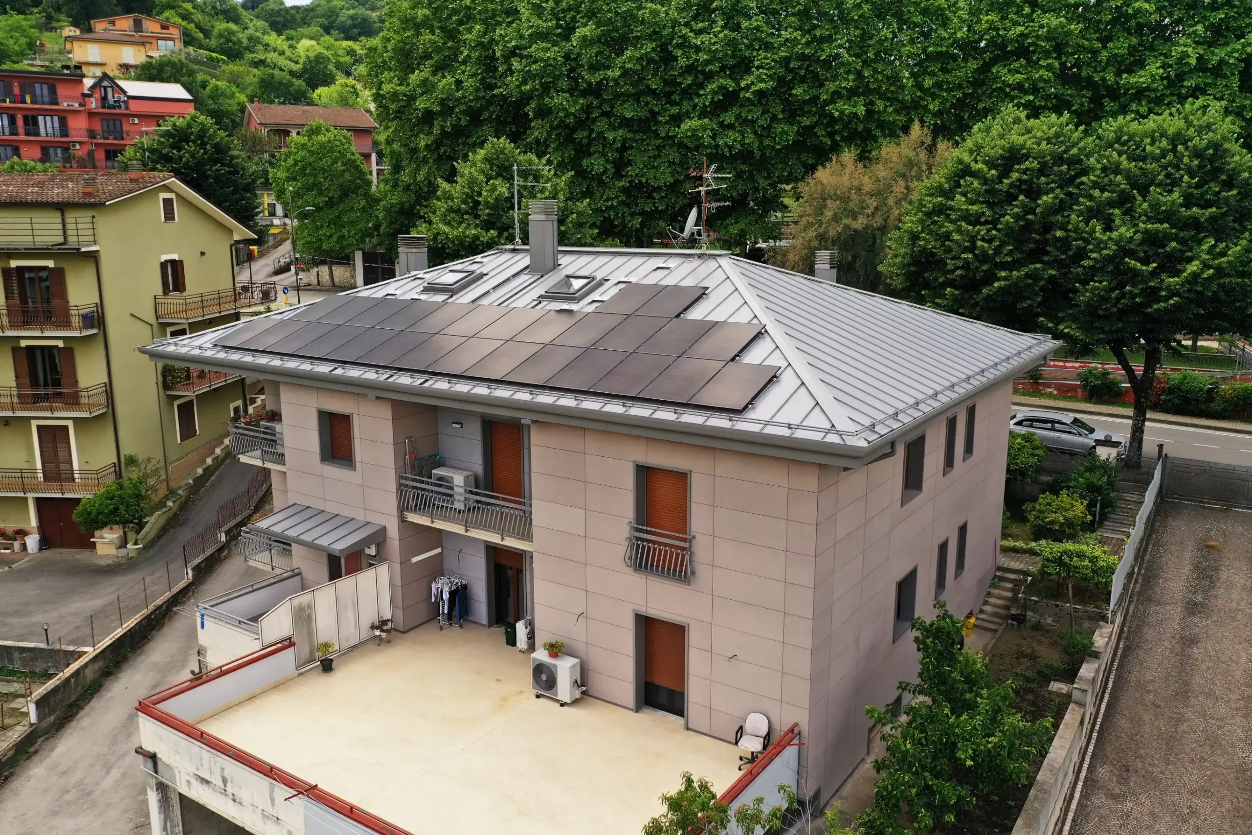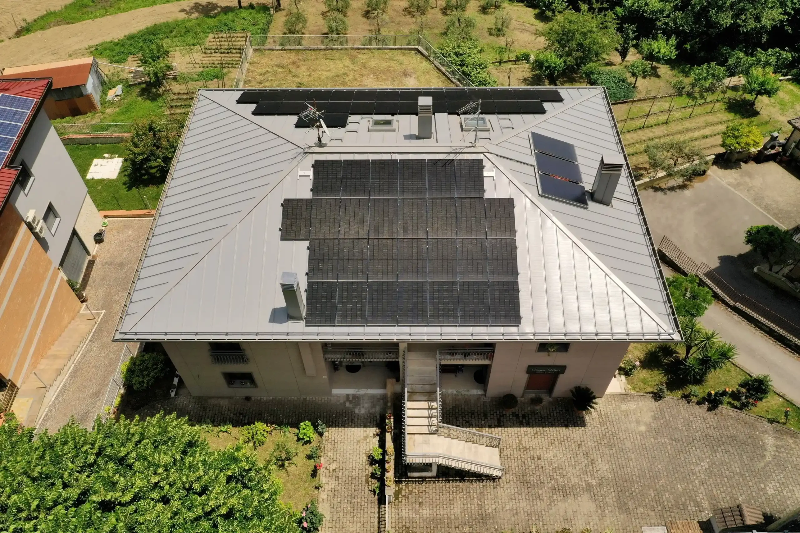 Copertura ventilata con finitura in lastre di alluminio profilate; Facciata ventilata, rivestita in pannelli di fibrocemento ecologico; Serramenti a taglio termico in alluminio.